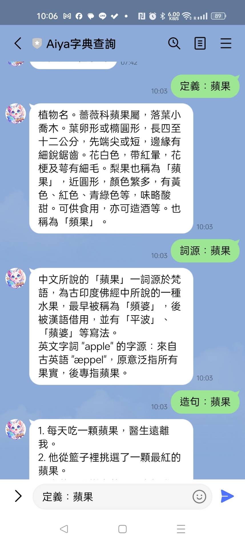 在 LINE 的對話框中,輸入 「定義:蘋果」, 就可以查詢到「蘋果」的定義啦~